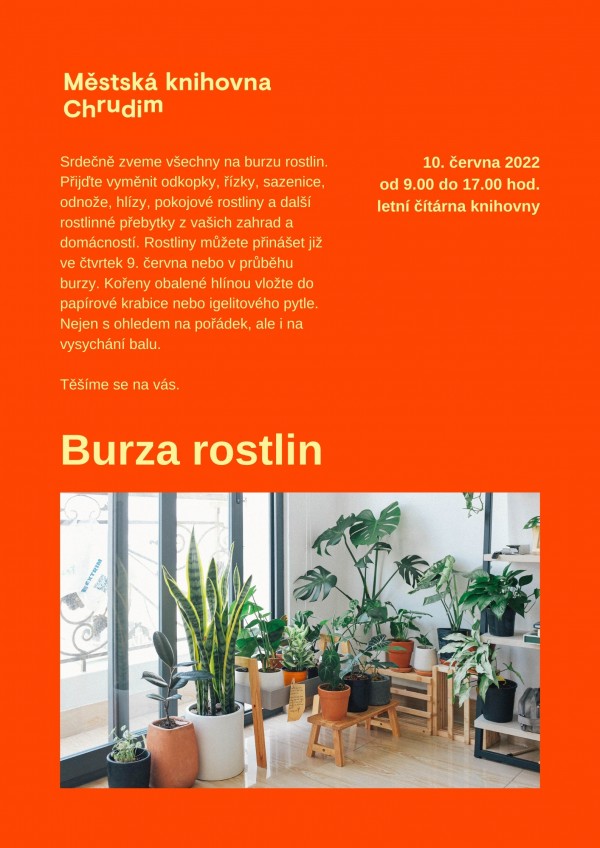 Městská knihovna Chrudim srdečně zve všechny na burzu rostlin, která se uskuteční 10. června od 9,00 do 17,00 hodin na zahradě knihovny. Rostliny můžete přinášet již ve čtvrtek 9. června nebo v průběhu burzy. Přijďte vyměnit odkopky, řízky, sazenice, odnože, hlízy, pokojové rostliny a další rostlinné přebytky z vašich zahrad a domácností. Kořeny obalené hlínou vložte do papírové krabice nebo igelitového pytle. Nejen s ohledem na pořádek, ale i na vysychání balu. Těšíme se na vás.